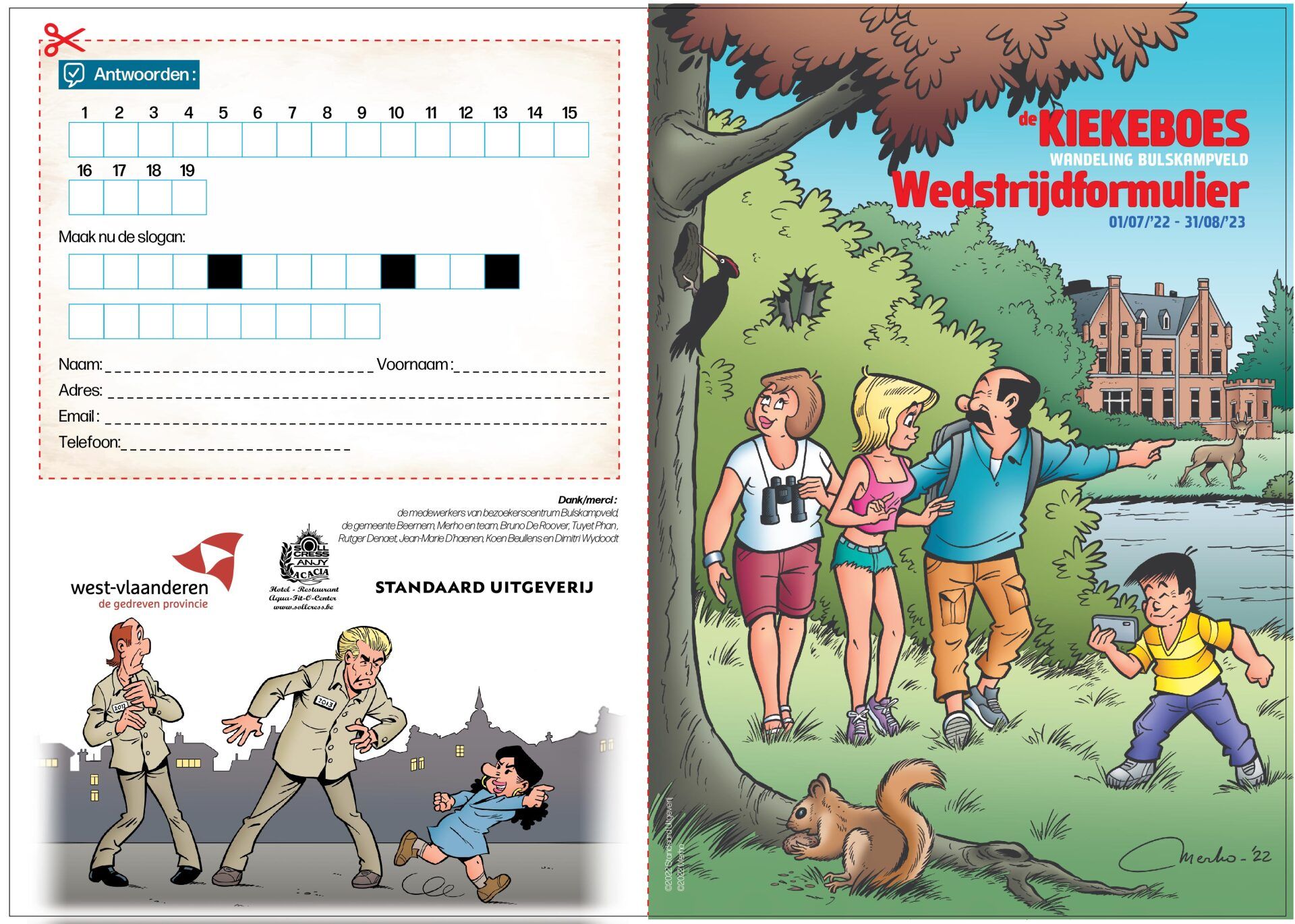 Je kan het formulier ook gratis afhalen aan de onthaalstand aan parking Driekoningen, in het bezoekerscentrum (dagelijks van 13.30 tot 16.30 uur), in het Urban Café, bij hoeve Colpaert, in het VOC of aan het inforekje aan de achterzijde van het kasteel (rechtover de kruidentuin)